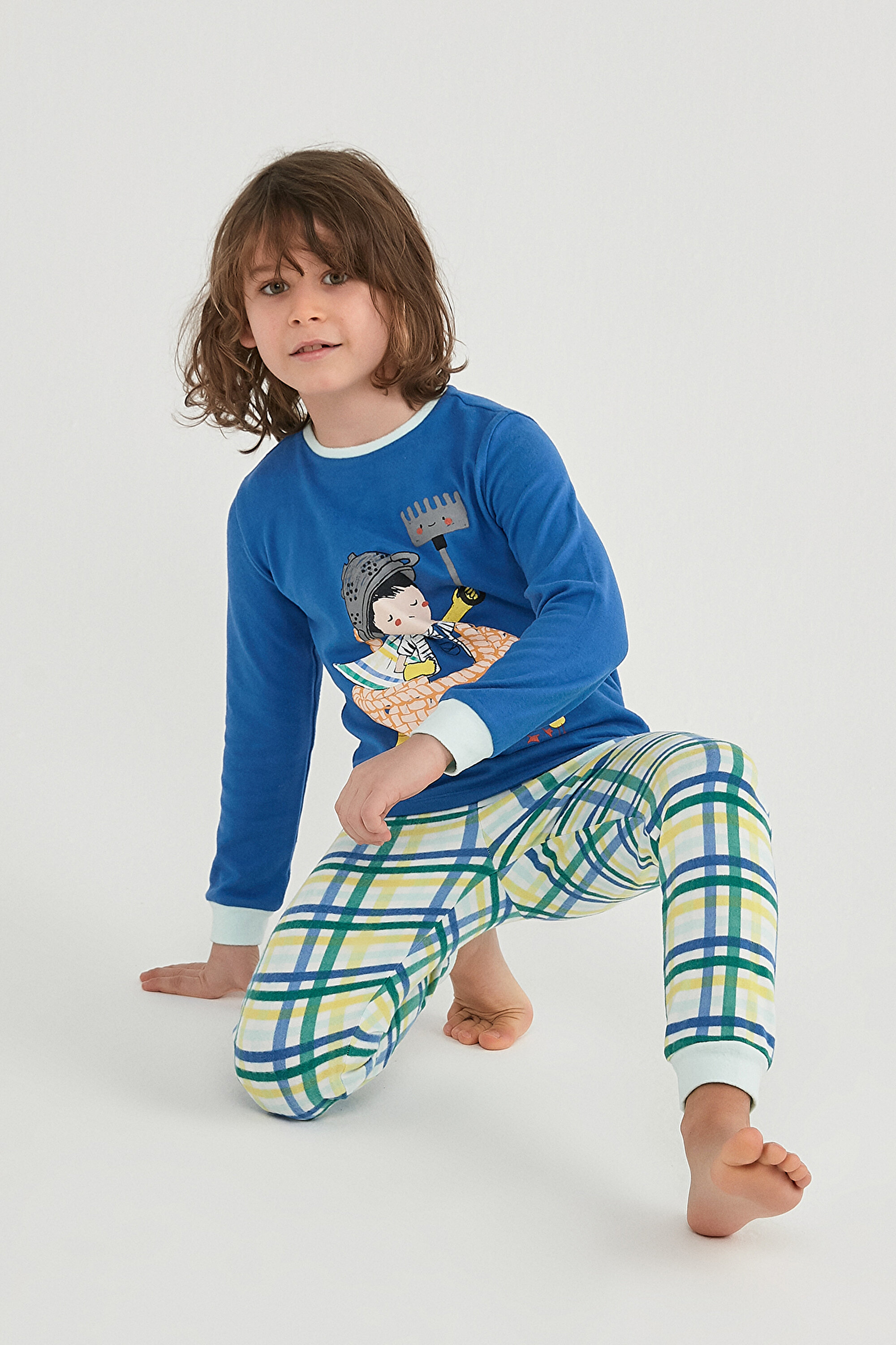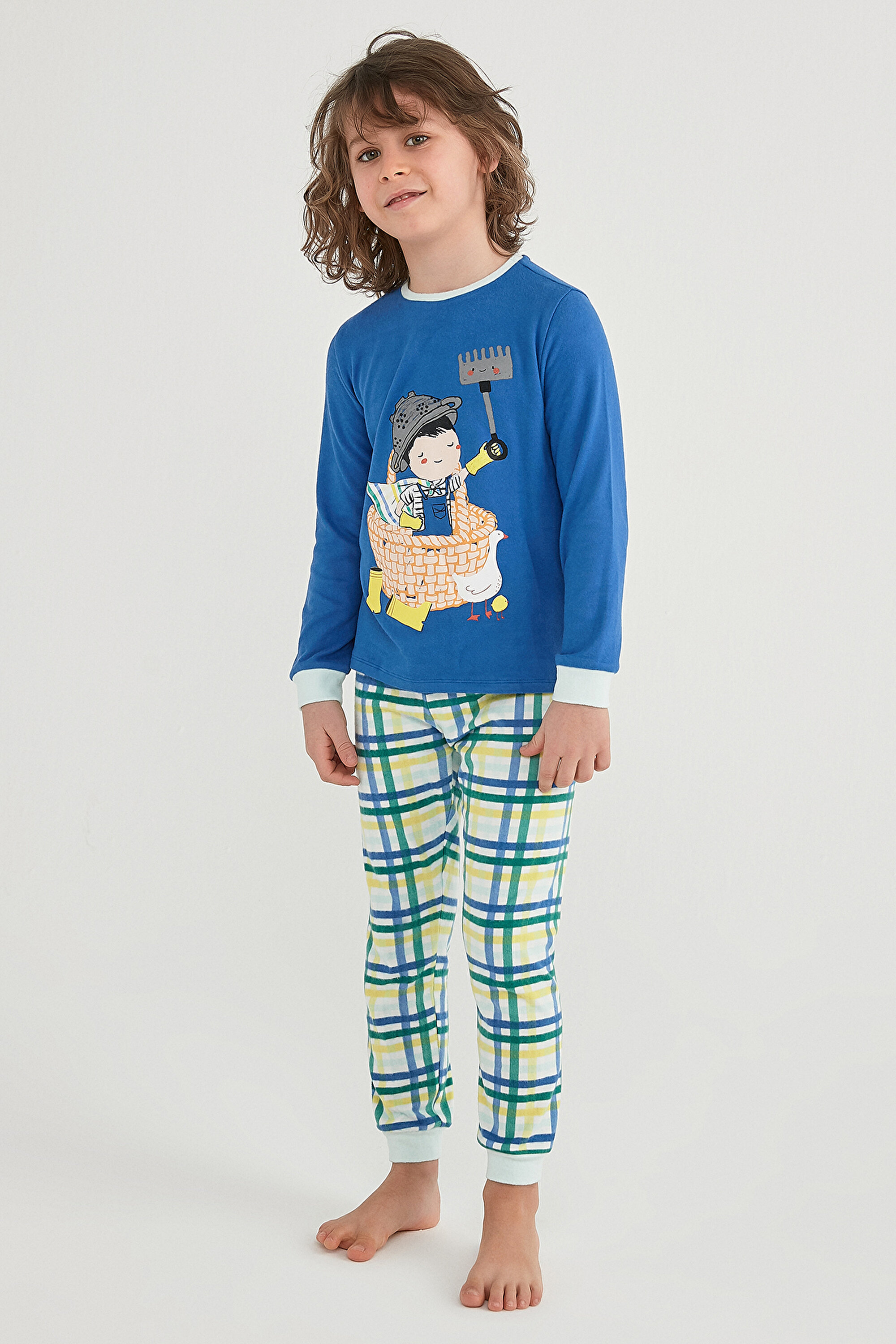 Boys' Super Farmer LS 2 Piece Pyjama Set will draw little ones into a fun world with its extraordinary theme! Defying cold weather with its thermal effect, the boys' Super Farmer LS 2 Piece Pyjama Set consists of a long sleeved pyjama top and large plaid patterned pyjama bottoms. The pyjama top, cheerfully completed with a knitted basket detail and cute farm animals, is adorned with a charming farmer figure that stands out with a cape on its back and a rake held high. Reflecting a superhero adaptation of the farmer theme, the boys' Super Farmer LS 2 Piece Pyjama Set prevents the cold from reaching little bodies with stylish wristbands and hood details that match the collar. Offering constant comfort with its flexible structure and soft texture, the boys' Super Farmer LS 2 Piece Pyjama Set will double the home enjoyment for the little ones !