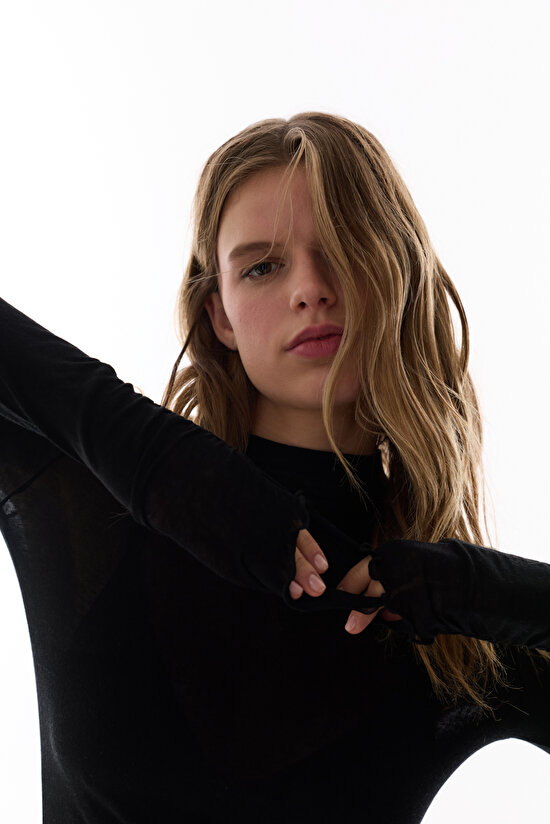 Siyah Kaşmir Dik Yaka Uzun Kollu Üst